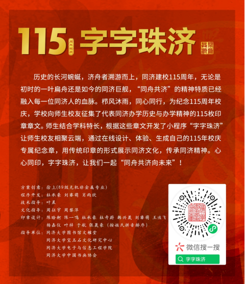 师生校友心怀对母校的感谢、感恩和期盼,这份深厚情感成为他们研发“字字珠济”小程序的初衷,这是对母校115岁生日的最好献礼。希望师生校友相聚云端,亲自体验在线设计生成同济印,加上名字做成校庆章,通过印信文化领略115岁同济的精神和文化。在属于同济人的节日里,祝福学校,祝愿所有同济人,心心相印,字字珠济,一起“同舟共济向未来”!(文中部分内容摘自于同济大学图书馆微信公众号)