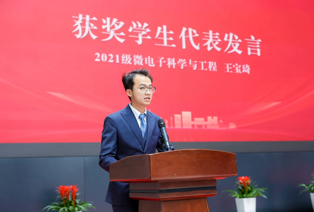 获奖学生代表2021级微电子科学与工程专业本科生王宝琦发言。他首先代表所有获奖同学向吴启迪教授、乔非教授、各位校友和老师致以崇高的敬意和由衷的感谢。他表示,启迪奖学金不仅引领青年学子在专业领域不断探索和创新,激发追求卓越、勇于挑战的精神,更能激励大家在未来的学习和工作中以更大的热情和决心投身于实践。生逢中华民族发展最好时期的青年学子,当以“制出将来之少年中国”为己任,以真才实学攻克“卡脖子”技术难关,积极弘扬启迪奖学金的精神,担时代之责,承报国之行,与学校同呼吸、共进步。