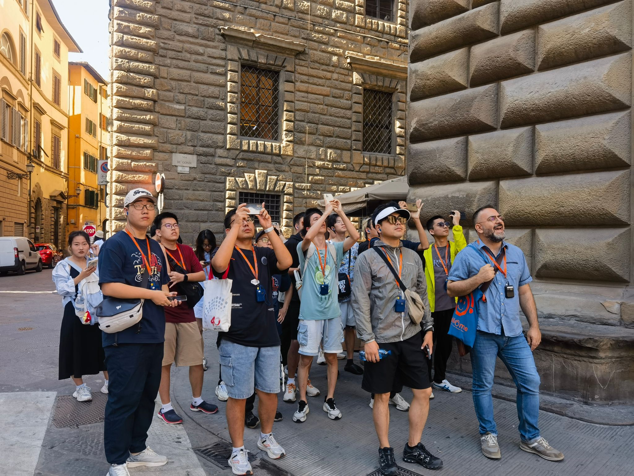 在佛罗伦萨,师生代表团跟随着意大利向导进行了一场别开生面的city walk。穿行在佛罗伦萨的街道,师生代表团体验了一场美妙的历史与艺术之旅。一路上建筑古迹庄严宏伟,让人印象深刻。在这里,大家体会到了建筑艺术的力量,它不仅仅是供人欣赏的美丽外壳,更是历史、文化和智慧的结晶。此外,在佛罗伦萨大学教授的带领下,同学们分批进入乌菲齐美术馆观摩学习,乌菲齐美术馆位于阿尔诺河畔,收藏了大量珍贵的文艺复兴时期艺术品。通过两位老师的讲解,同学们不仅欣赏到了这些伟大画作的艺术之美,还深入了解了文艺复兴时期的历史背景,跟随艺术家们对人类自身、自然与世界文明进行深刻思考。