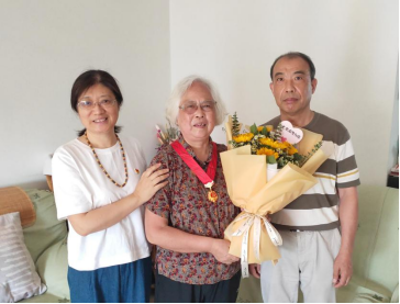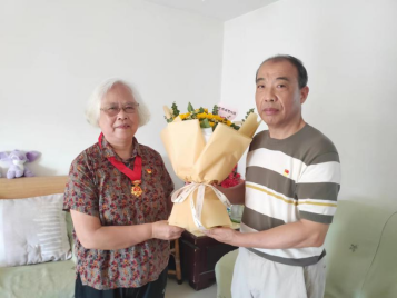 家住闵行的汤霞森同志,1973年入党,今年入党满50年。支部代表党组织送上”光荣在党50年纪念章”,并代表党支部献上鲜花以示祝贺。