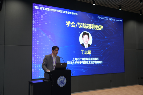 副院长丁志军教授在致辞中对各位嘉宾、专家学者和参会代表表示热烈的欢迎,指出了不确定性分析与知识发现相关研究对推动人工智能和大数据的理论研究及应用具有重要的意义。同时,介绍了同济大学计算机学科在蒋昌俊院士带领下的学科发展历程,该学科目前QS全球数据科学领域排名中位居第36位,并在国内最新一轮学科评估中位列“A”学科。