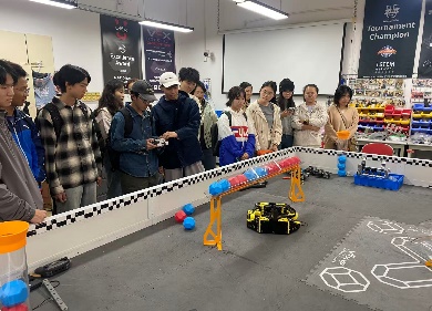 见面会结束后,两班分成四组,由学长引导分组前往院史馆、智信楼无人机实验室、h楼智能车竞赛实验室和VEX实验室。实验室负责人详细介绍了实验室在自动驾驶感知算法、无人系统协同控制等方向的研究成果,展示了搭载多传感器的智能实验平台——从激光雷达实时建模到车辆路径规划仿真,同学们围绕技术原理与应用难点积极提问,现场互动氛围热烈。