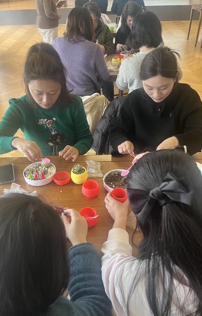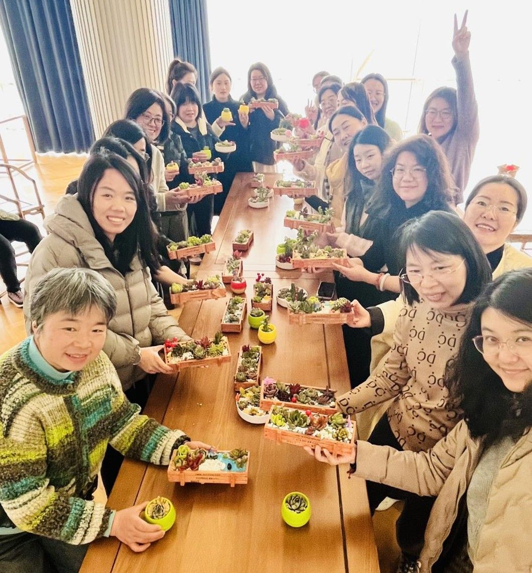 正念冥想环节中,参与者伴随轻柔的引导语静心调息,暂时卸下工作与学业的压力,在静谧的氛围中与自我深度对话,让纷乱的思绪得以沉淀,身心得到充分舒展。随后的多肉DIY创作与作品展示环节,将现场氛围推向高潮。大家亲手培土栽种、搭配造型,将春日的温柔意蕴与蓬勃生机,尽数凝注于方寸盆栽之中。指尖摩挲泥土的温度,用心雕琢每一处细节,每一件作品都承载着创作者独一无二的巧思与心意。