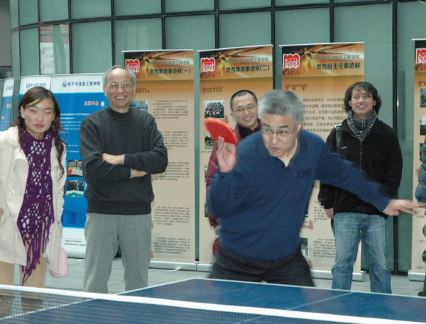 本届“电信――电气杯”教工乒乓球团体赛,共有各基层工会组织的9个代表队参赛。每队分别由1名领队兼教练、两名男运动员、1名女运动员组成。运动员中既有院、系领导,教授、博导参赛,又有普通教工参加。比赛分小组循环赛和决赛两个阶段进行。
