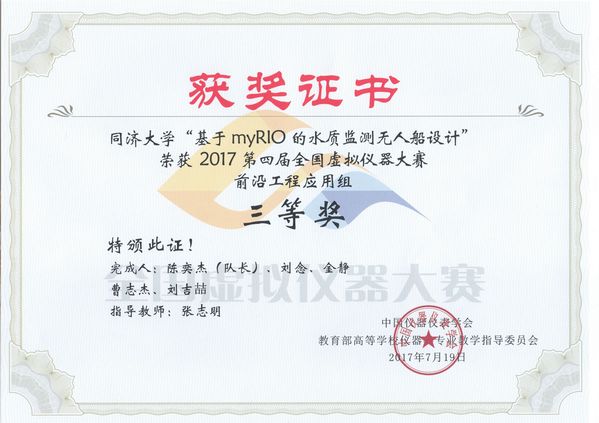 学生组建的同济大学参赛队伍“新风队”在前沿工程应用组决赛中喜获佳绩,参赛作品《基于myRIO的水质监测无人船的设计》获全国总决赛三等奖。
