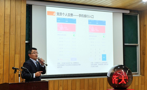 趁着十九大召开的东风砥砺奋进,信心满满再创辉煌!随后,冯身洪、苗俊华、王峻、陈德一同启动水晶球,宣告同济大学党费通正式启用。与会党员现场拿起手机,在交通银行上海同济支行窦丰雷行长的演示下,在党费通平台交纳了本人的当月党费。