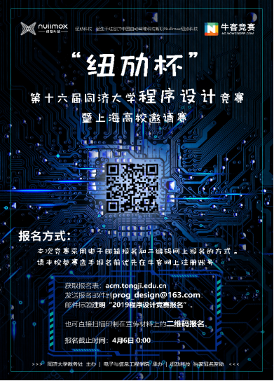承办,诞生于硅谷的自动驾驶新锐“纽劢科技”独家冠名赞助。竞赛旨在普及计算机程序设计活动,提高大学生计算机程序设计水平和运用计算机分析问题、解决问题的能力。同时,也将为同济大学组队参加第44届ACM国际大学生程序设计竞赛选拔队员、锻炼队伍。