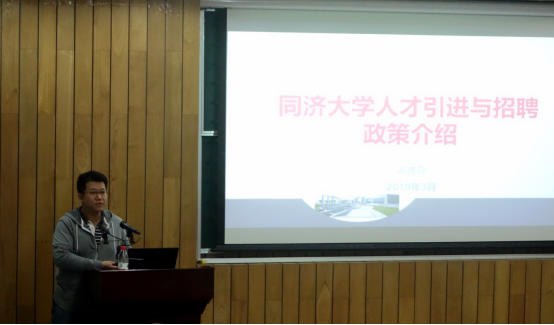校人才办副主任许维教授首先代表学校对来自五湖四海的优秀青年学者表示热烈欢迎。随后,许维教授从同济大学现有人才队伍、高层次人才招聘、助理教授、博士后招聘四个方面,介绍了国家、上海市、学校三个层面的人才政策,鼓励在座的青年才俊积极申报人才计划,并代表学校欢迎他们加盟同济大学。