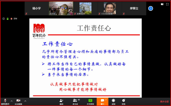 团学骨干共同参与。首先,王力生老师以“责任心杂谈”为主题展开,并结合自己7年级时插队下乡安徽的难忘经历,为学生党员们做了精彩分享,王老师通过讲述自己在牧场值班时修理制冷设备以保证牛奶正常加工生产的故事,教导同学们不要怕自己身微言轻,只要努力不放弃,就会取得成功;通过讲述自学在牧场修理炼乳喷雾塔的故事,教导大家自己认准了的事情,只要通过自己一步步努力就一定会成功,并且会得到自己和大家的认可。接着,王力生同志为大家讲解了责任心的定义、层次、构成要素等,着重强调了工作责任心的重要性,因为责任心是干好工作的前提,拥有责任心才会拥有细心、耐心、爱心,可以让我们更从容地面对未来的生活,面对遇到的困难和挑战。专题活动的第三个环节是互动交流,学生党员和团学骨干与王力生同志进行了线上交流。冯舜同志提到对于人生道路的选择感到迷茫,希望能够得到一些建议。王力生同志便以自己二战高考的经历勉励大家珍惜当前的学习机会,先把当下的事情做好,目标是用来一步一步超越的。宋法兴同志提问:自己需要承担的责任超出了能力范围怎么办。王力生同志回答:要平衡好自己的能力与责任,选择和自己相适应的环境。黄卓仪同志因为没有很多的机会接触社会,因而想了解如何提高自己的社会责任感。王力生同志以自己儿子结合社会发展形势转专业的故事为例,告诉大家在学校里也可以锻炼自己独立自主的能力,并且要学会为自己的选择主动承担责任。胡德央同志提问:青少年应当如何实现自己的历史使命。王力生同志认为,我们每一个人只要尽自己的努力,把自己应该做的事情做好,历史使命就完成了,社会的价值观是一个逐渐建立的过程,需要每一个人齐心努力,那么我们的历史使命就达到了。