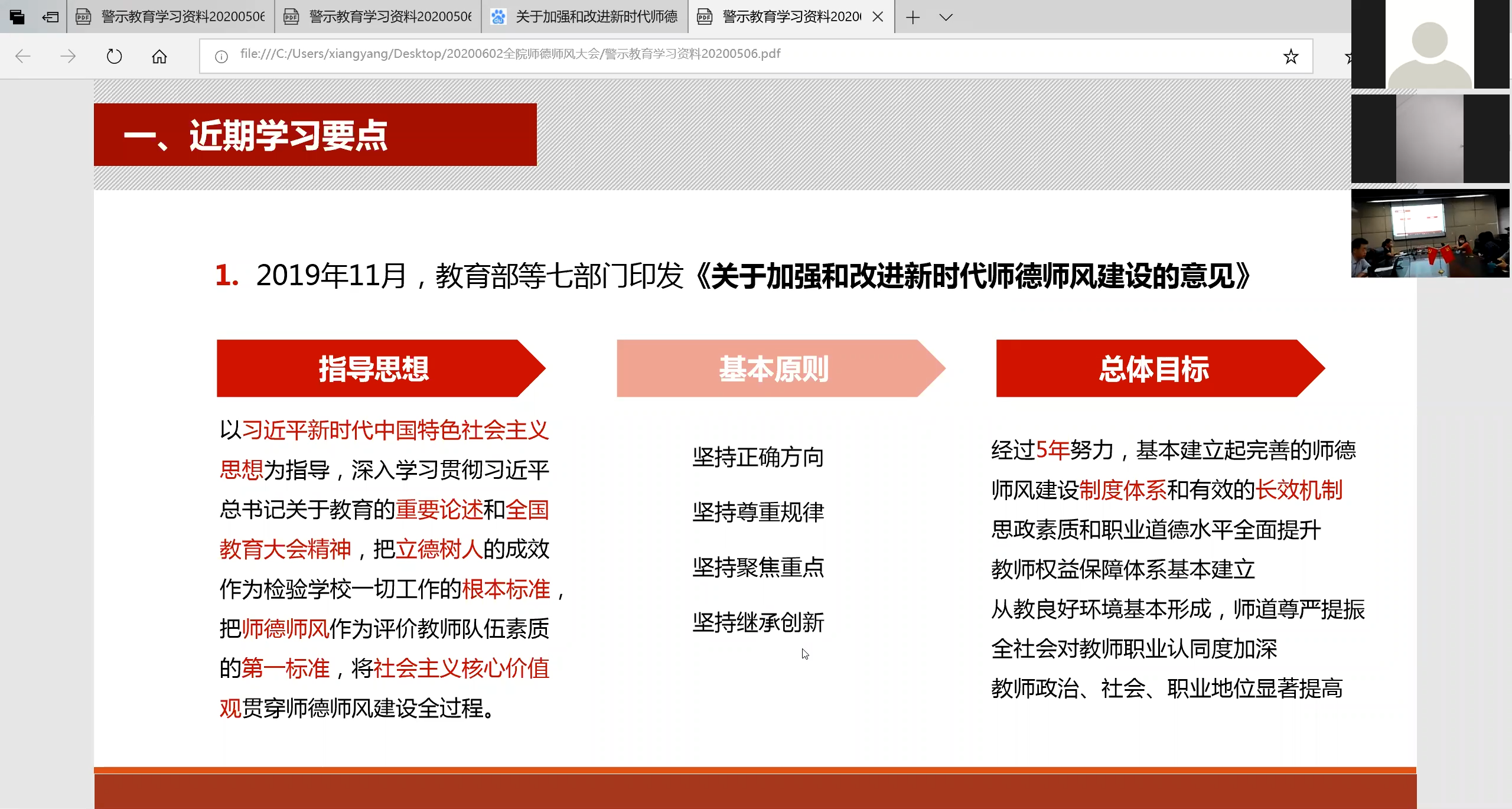 在报告的第一部分,向阳书记对《关于加强和改进新时代师德师风建设的意见》、《新时代公民道德建设实施纲要》和《新时代爱国主义教师实施纲要》、上海高校教师职业行为十项准则及失范行为处理指导意见,以及同济大学师德师风相关文件进行了详细的解读,强调高校教师要立德树人,遵守教师道德规范。第二部分则重点对2019年高校相关的教育热点、教育政策以及教育舆情事件等做了细致的讲述,要求教师在日常工作、教育科研以及生活中要深入学习党和国家文件精神,明确底线红线,做好教师本职工作。报告的最后,向阳书记向全体教师宣讲了同济大学2020年师德师风建设重点工作内容。