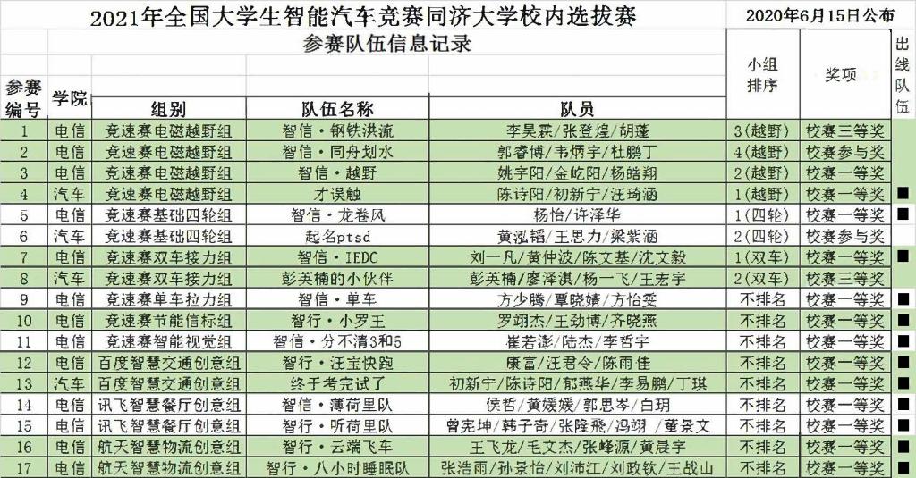 基地赛道举行。按照校内选拔赛规则,参赛队伍的名次(成绩)由成功完成现场赛道比赛任务的时间来决定。每个组别的参赛队伍按总体最优成绩排序,获得第一名的队伍将代表同济大学参加今年7月举行的第十六届全国大学生智能汽车竞赛华东分赛区比赛(2021竞速赛每个组别最多允许1支队伍)。另外,因本年度创意赛报名规则改变,创意赛3个组别的队伍已于5月参加全国线上选拔初赛决出下一阶段参赛队伍(2021创意赛每个组别最多允许2支队伍)。根据比赛成绩,13支队伍获校赛一等奖,2支队伍获校赛三等奖,2支队伍获校赛参与奖。获得校内赛奖项的队伍,可申请校本科生院认可的创新学分。