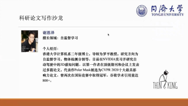 谢恩泽现为香港大学2019级博士生,研究方向为自督学习,物体检测等,当前研究方向为自动驾驶中的三维感知问题。他曾以第一作者在顶级期刊和会议上发表过多篇论文,代表作Polar Mask被选为CVPR 2020十大最具影响力论文,曾两次在国际竞赛中取得冠军,谷歌学术引用量达800+。他分享的主题是如何做好科研工作,他强调研究主题的重要性,认为好的主题是成功的一半,并就学术期刊/会议投稿流程中的重难点——回复审稿人意见以自身为例进行了详细的说明。面对同学们的热情提问,谢恩泽也知无不言,使同学们收获了许多宝贵的经验。