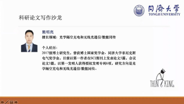最后一位分享人是熊明亮博士,同济大学2017级博士研究生,曾获博士国家奖学金、同济大学菲尼克斯电气奖学金,目前以第一作者在SCI期刊上发表论文5篇,会议论文3篇,以第一发明人获得授权发明专利6项,研究方向是光学隔空充电和无线光通信/数能同传。他围绕创新-阅读-写作的关系,系统讲解了科研工作中从灵感到发表的整个过程,分享了自己在每个环节中总结的经验和方法。他以自己的论文为例,翔实地为大家讲解了科研中常出现的困惑与问题,并给出了自己的观点。熊明亮将自己在科研方面的经验娓娓道来,为同学们的未来的科研道路提供了指导。