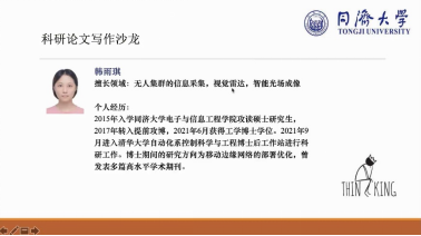 第一位分享的是韩雨琪博士,现为清华大学博士后,研究方向为移动边缘网络的部署优化。她分享的主题为引言的基本结构,从论文大纲、目的、思路等方面讲解引言该如何写,并以自己的第一篇论文的初稿和终稿举例,强调引言中首句的重要性,以及如何添加数据使自己的引言更有说服力。听了韩雨琪的分享,大家收获颇丰。