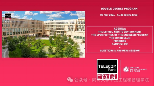拟于5月7日(周二)16:30举办巴黎高等电信学校双文凭项目宣讲会,欢迎报名参加。会议信息如下: