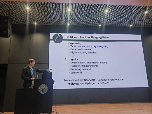 David Cebon教授开篇点明长途道路货运的行业定位——作为全球经济供应链的核心环节,其能源消耗与碳排放占比突出,却因技术特性与运营场景限制,成为交通运输领域“难脱碳”的关键。他进一步拆解技术痛点:重型货车需持续输出大功率以保障长途运输效率,而当前主流的电池电动技术在续航里程、快速补能能力及载重适配性上均存在瓶颈,难以满足长途货运的实际需求,亟需探索更适配的脱碳路径。
