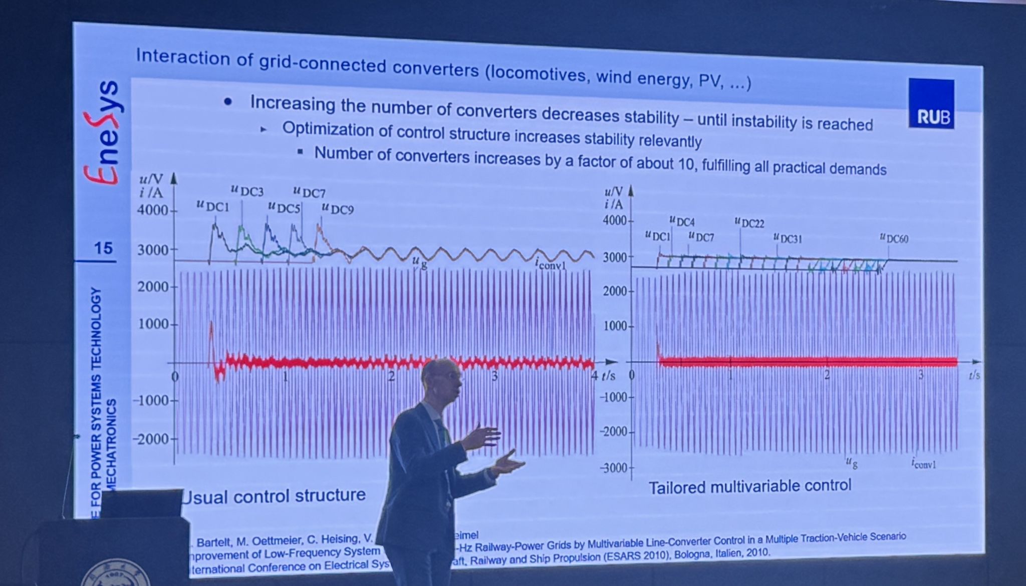 在此报告中,Volker Staudt教授介绍了基于物理机理的建模与控制方法,并通过多个以轨道交通系统为核心的实际案例阐述了相关挑战及应对策略。针对不同问题,报告展示了改进的控制技术与考虑非理想效应的模型方法。多数研究以铁路系统为背景,其核心思想同样可推广至可再生能源变换器控制领域,如风力发电与光伏发电系统。具备能量感知特性的感应发电机控制策略,可显著提升直流母线电压稳定性;全速域无传感器控制以及电网友好型变换器运行等先进成果。这些研究进展充分体现了EneSys研究所在理论研究与工程实践结合方面的领先地位,为未来高效、可持续的能源系统发展提供了有力支撑。