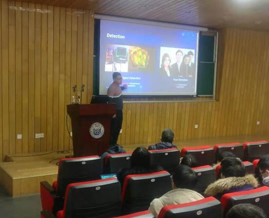 胡国圣博士的报告题目是“人脸识别:从学术界到工业界”。人脸识别是一种用途广泛的计算机视觉技术,近年来已取得了显著的研究进展,受到了学术界与工业界的广泛关注。报告从人脸识别的基本概念入手,介绍了人脸检测模块,特征点自动标注模块,及人脸识别模块。胡博士分析了上述三大模块的研究热点的变迁,详细介绍三大模块的当前研究热点及难点。最后,胡博士介绍了人脸识别技术在国内外的应用情况,对本领域的发展趋势做出预测和展望,并在现场与一些同学进行了关于人脸识别技术安全性的探讨。报告的内容丰富,讲解详细,不仅让同学们开阔了视野,还收获了不少“干货”,对今后的学术视角和科研工作都有很大的启发和指导作用。