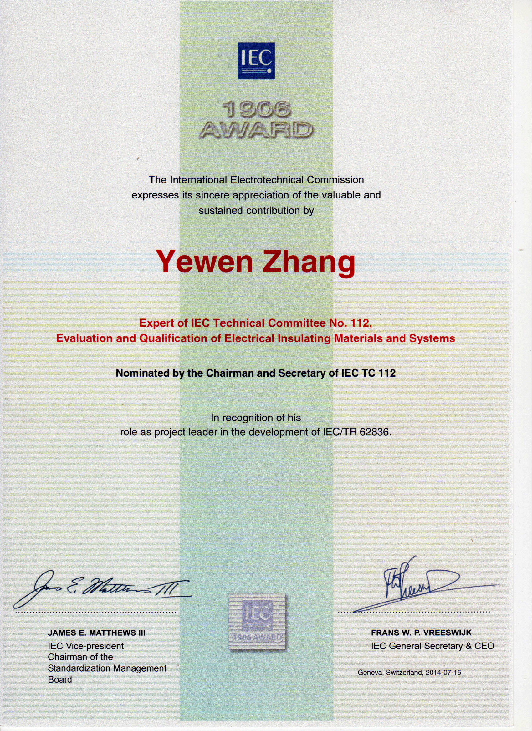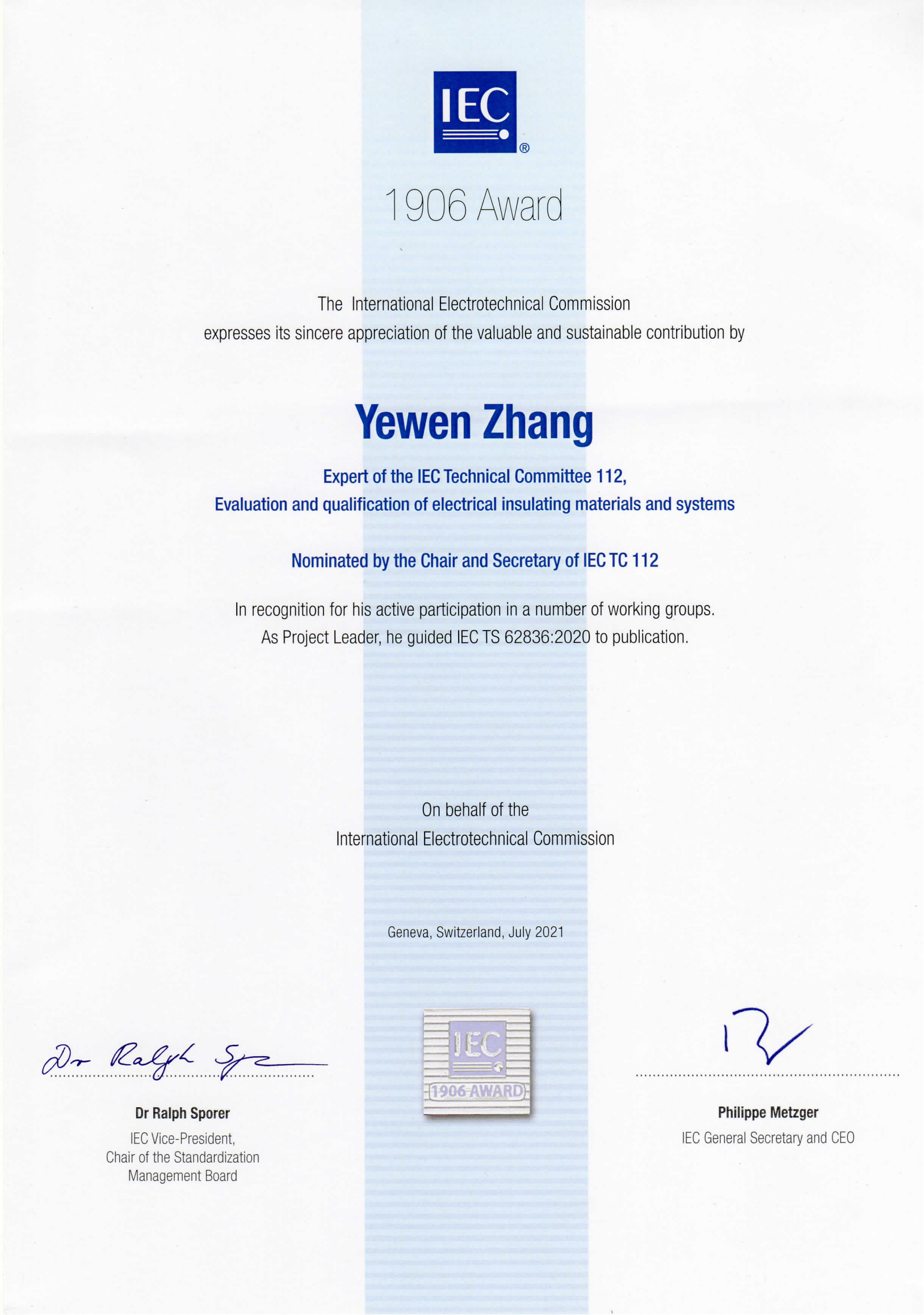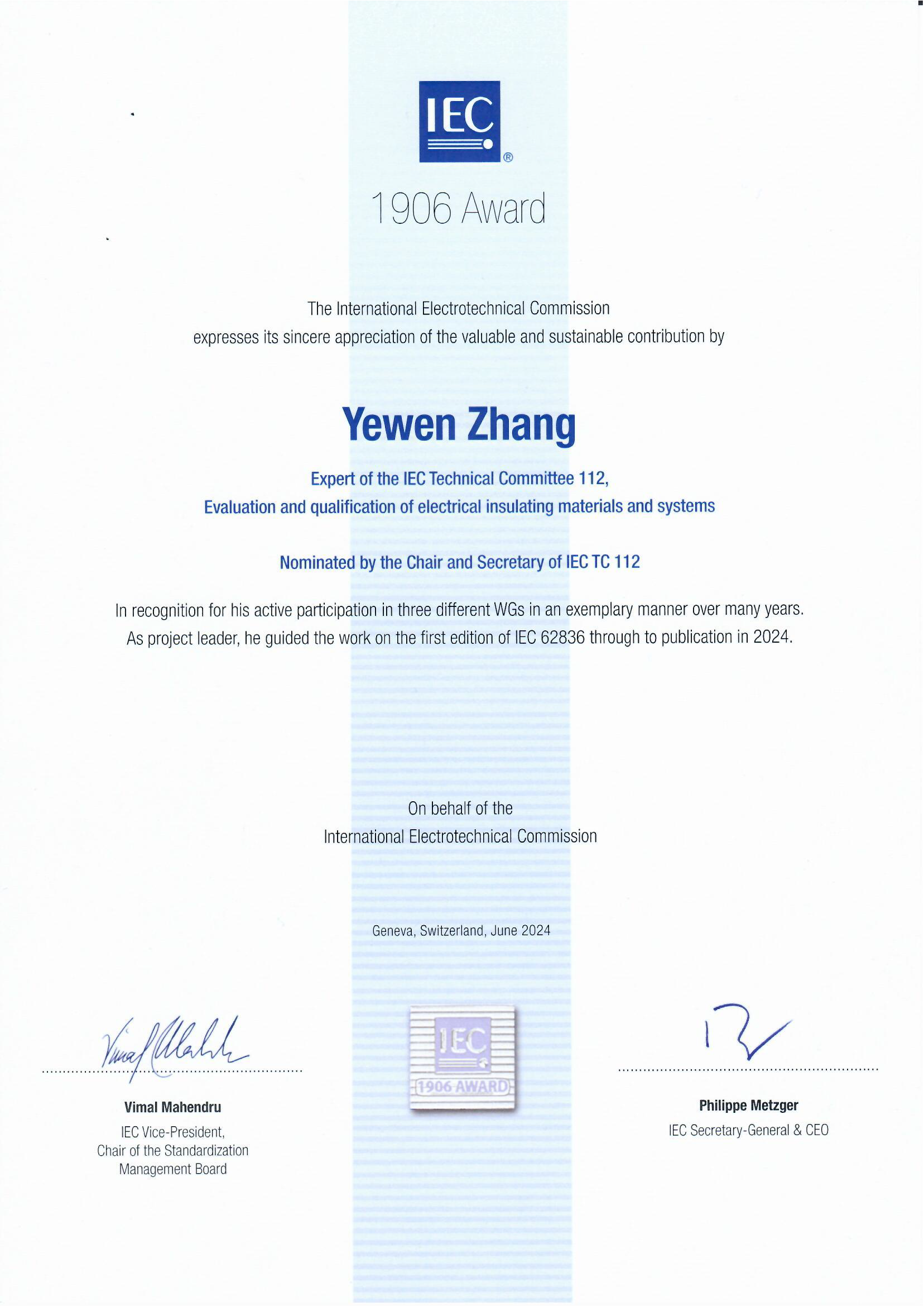 张教授在这一过程中持续的贡献,使他于2014年、2021年和2024年三度获得“IEC 1906奖”,在这一IEC最重要的奖项中实现了“三连冠”。这一成就不仅为我国在国际绝缘评定领域赢得了更高的话语权与影响力,也提升了张教授的知名度与国际声望。同时,他还担任国际大电网会议CIGRESC-D1(绝缘材料与新兴检测技术委员会)的中方副代表,曾担任IEEEDEI的行政委员(AdCom),在电气绝缘领域的各个主要组织都树立了作为我国代表的良好形象。