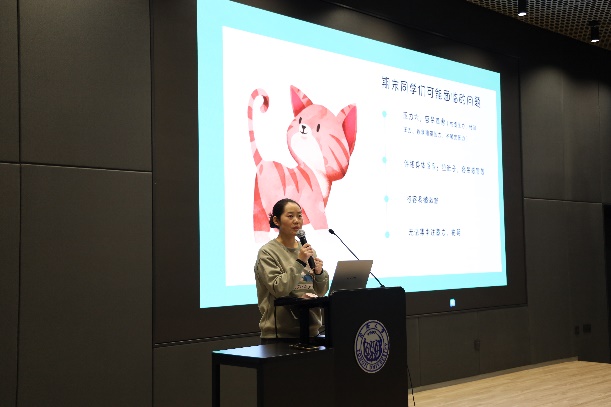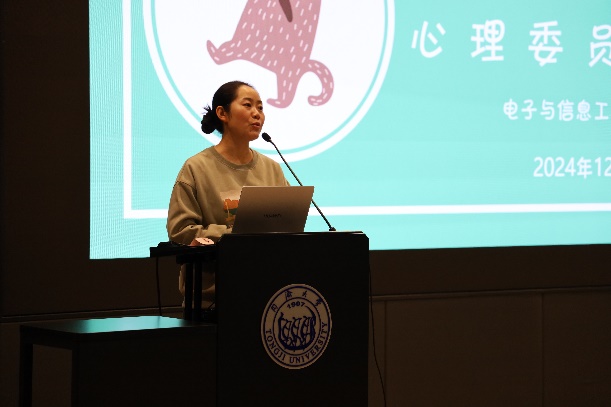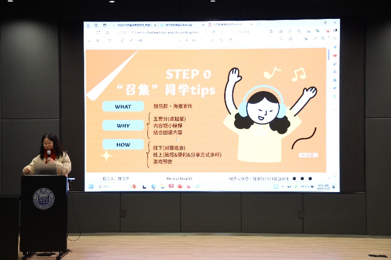2021级自动化班级心理委员姚俞泽同学进行班级优秀案例分享。她提到,各班级在开展心理活动时,可以围绕心理健康活动月某个主题词(如“心理韧性”)寻找心理学常见或有趣的理论或现象开展深入的交流,也可从同济大学心理中心深夜树洞栏目选择合适的内容参考。