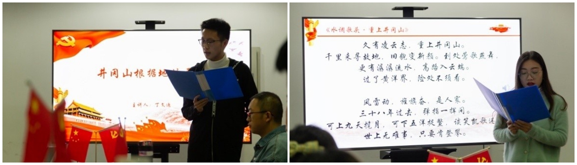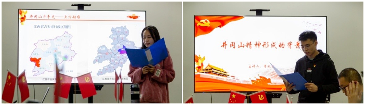 活动伊始,支部书记方春华老师致辞。方老师指出,2020年是中国共产党带领中国人民实现第一个百年奋斗目标的关键之年。在这一年的疫情、洪涝考验中,中国共产党人始终奋战在第一线,这种为了人民的利益前仆后继的奉献和斗争精神,正是井冈山革命精神的延续和发扬。希望通过学习井冈山的历史,深化党员们对“四史”内涵的理解,传承红色基因、坚定理想信念,汲取前行力量。