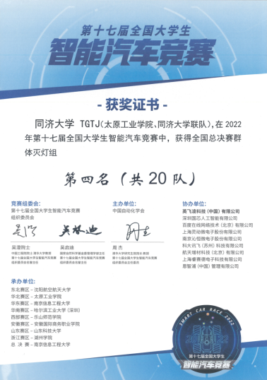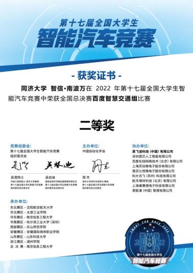 同济大学参加总决赛的另外四支队伍,同样有所斩获。“智行•神话千里”队由陈冠佑(信息安全)、周宏韬(信息安全)、王相栋(自动化)、郭子瞻(自动化)、韩意(自动化)五位大二同学组成,获得完全模型组全国二等奖;“智行•YYYDS”队由罗翊杰、刘一凡、金屹阳三位自动化大三同学组成,获得平衡单车组全国二等奖;“智行•南波万”队由王聪聪(电子科学与技术)、胡昊育(计算机科学与技术)、陶思月(计算机科学与技术)、张氏博文(自动化)四位本科同学组成,获得百度智慧交通组全国二等奖。“智行·稳稳的幸福”队由杨皓翔、王劲博、刘冰三位自动化专业大三同学组成,获得RTT创新专项奖,并和太原工业雪缘园足球比分