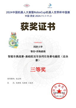 人工智能+机器人竞赛实验室三支队伍由张志明、朱劲两位老师指导并带队参赛。在双车协同任务赛电磁组赛项中,由王圣睿(队长/电子信息工程)、项卢羽成(通信工程)、曹文旭(自动化)组成的智信•济海先锋队获亚军(一等奖),张新烁(队长/自动化)、毛政珽(自动化)、王旭光(电气工程及其自动化)组成的智信•济海破晓队获得三等奖。在桌面清洁机器人赛项中,由林佳铭(队长/电气工程及其自动化)、陈泽钰(通信工程)、周振堂(自动化)、彭心怡(自动化)、周庚栋(硕研,控制科学与工程)组成的智信•济海澄波队获三等奖。