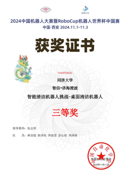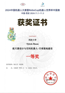 在月球基地建设机器人赛项中,ROBOCUP竞赛实验室TJArk-Moon队伍在陈启军、刘成菊老师的指导下,获得亚军(一等奖)。该队由张旭晖同学辅助带队,任筱舒(队长/人工智能)、何怡凡(自动化)、罗烨(自动化)、王相宜(国豪书院)、王一飞(国豪书院)组队参赛。