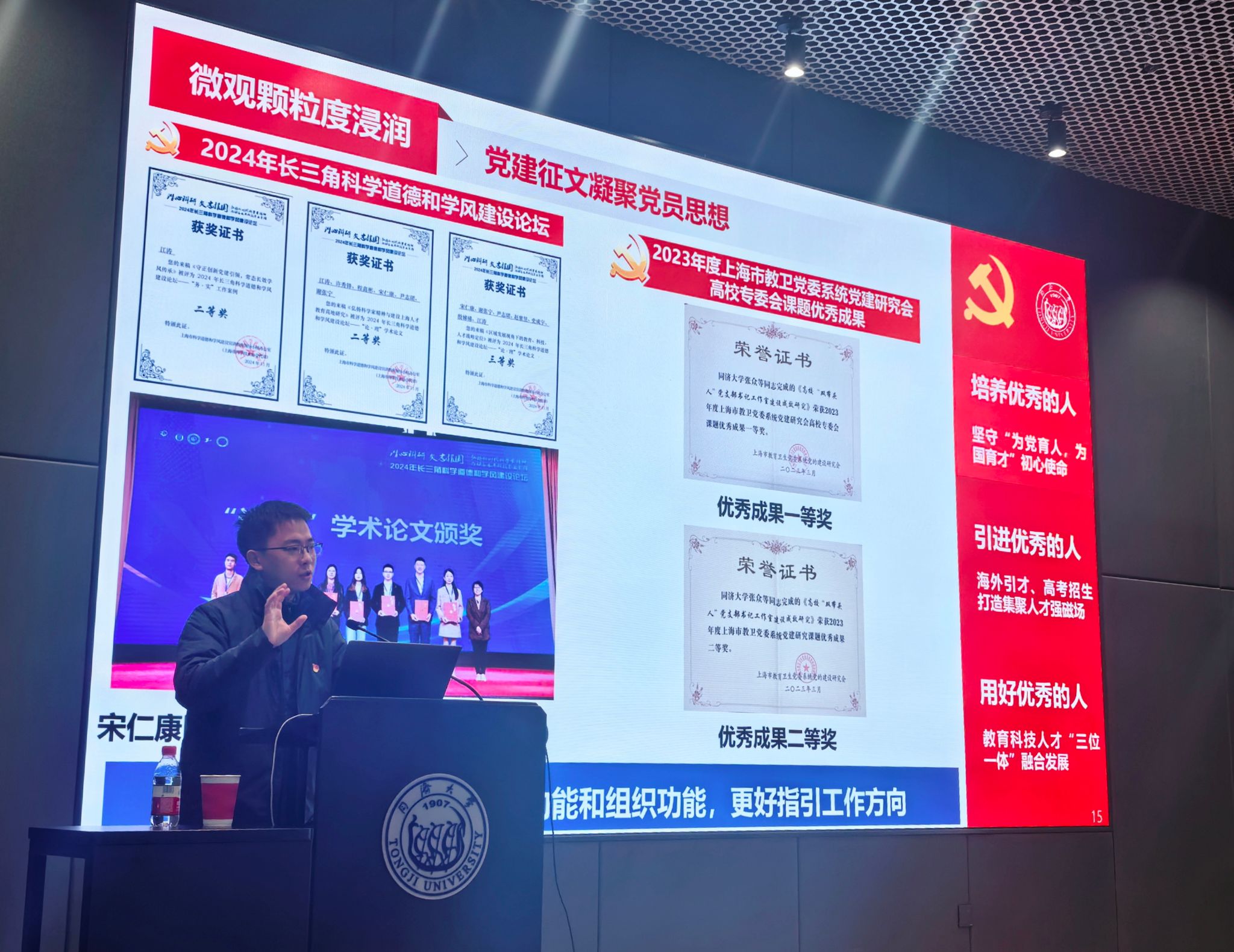 师生混合第十党支部书记江涛教授以高质量党建推动高质量发展为主题分享了全国样板党支部的建设经验,围绕宏观和微观两层颗粒度,分别阐述了党建工作如何与团队发展和师生发展协同共进。一是以宏观颗粒度引领,增强全局发展意识,促进支部建设与科研团队共同发展,支部坚持四个面向,积极建设科研平台,凝聚全员育人力量,全方位助力学生培养。二是以微观颗粒度浸润,以一流党建引领师生发展,推动教师党员发展和学生党员发展“同规划、同部署、同推进”;聚焦教育、科技、人才“三位一体”协同融合发展,围绕学生思政和青年发展,着力引进优秀的人、用好优秀的人、培养优秀的人。